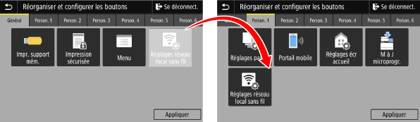 Vous pouvez réorganiser les boutons sur l’écran [Accueil] et déplacer les boutons vers d’autres onglets.