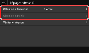 1 | Appuyez sur [Obtention automatique]. L'écran [Régl. adresse IP (Obtention automatique)] s'affiche. |