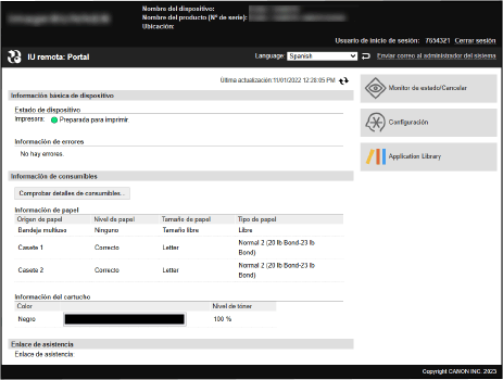 Cuando inicia sesión en la IU remota, aparece la página del portal (página superior de la IU remota). Puede comprobar el estado de las operaciones del equipo, ver diversa información y cambiar las opciones con los botones.