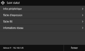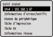 [Afficher l'adresse IP] L’écran [Suivi statut] du Modèle à LCD noir et blanc