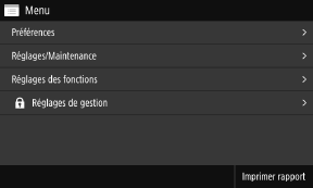 Modification de l'affichage de l'écranVous pouvez modifier l’affichage du panneau de commande, par exemple en changeant la langue et les unités d’affichage, ou en affichant ou en masquant les messages. [Réglages d'affichage] Vous pouvez inverser les couleurs de l'écran et régler la luminosité pour que l'écran soit plus facile à voir. [Accessibilité] Effacement automatique des paramètresPar défaut, si aucune opération n'est effectuée après un certain laps de temps, les paramètres configurés sur l'écran sont effacés et l'écran [Accueil] s'affiche. Vous pouvez modifier le délai d'effacement des paramètres et l'écran qui s'affiche ensuite. [Délai réinit. automatique] [Fonction après réinit. auto.] |