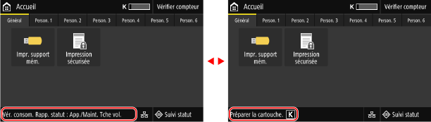 sur le panneau de commande. Utilisez cet écran pour consulter les informations de l’appareil, l’utilisation et les journaux, les paramètres réseau ainsi que les informations concernant les erreurs. Écran [Suivi statut]Modèle à écran tactile | Modèle à LCD noir et blanc | |
