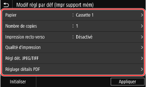 Vous pouvez également réinitialiser les paramètres aux paramètres définis ici en appuyant sur [Réinit.] sur l’écran de paramétrage de l’impression.