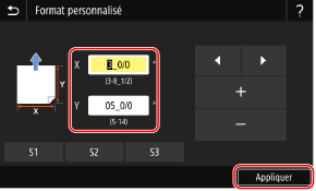 2 | Entrez les valeurs dans [X] et [Y], et appuyez sur [Appliquer]. Sélectionnez [X] ou [Y] et saisissez la longueur de chaque côté en utilisant [+] et [-], avec  /  pour déplacer le curseur entre les chiffres pour la saisie des nombres entiers et des fractions. Lorsque des formats non standard fréquemment utilisés sont enregistrés, vous pouvez les appeler en appuyant entre [S1] et [S3]. |