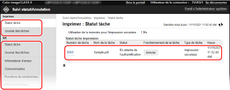 Si vous avez saisi un nom d'utilisateur dans [Nom d'utilisateur] pour vous connecter en mode Utilisateur général, seul l'état des tâches d'impression de cet utilisateur est affiché.