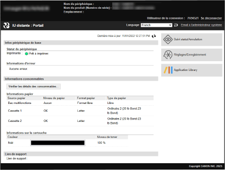 Lorsque vous vous connectez à l'interface utilisateur distante, la page Portail (page d'accueil de l'interface utilisateur distante) s'affiche. Depuis cette page, vous pouvez vérifier l'état d'utilisation de l'appareil, afficher diverses informations et changer les paramètres au moyen de boutons.