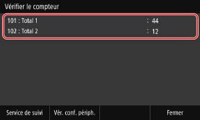 Opérations disponibles sur l'écran de vérification du compteurAppuyez sur [Service de suivi] pour vérifier la connexion au serveur de suivi. Exécutez cette opération pour envoyer régulièrement les informations de l'appareil au serveur de suivi. Appuyez sur [Vér. conf. périph.] pour vérifier la configuration des équipements en option installés sur l'appareil.