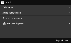 Cambiar la visualización de pantallaPuede cambiar elementos de visualización del panel de control como el idioma y las unidades, y mostrar u ocultar mensajes. [Opciones de visualización] Puede invertir los colores de la pantalla y ajustar el brillo para que se vea mejor. [Accesibilidad] Borrar las opciones automáticamenteDe forma predeterminada, si no se realiza ninguna operación durante un determinado periodo de tiempo, se borran las opciones configuradas en la pantalla y aparece la pantalla [Inicio]. Puede cambiar el tiempo que debe transcurrir antes de que se borren las opciones y aparezca la pantalla posterior. [Tiempo reinic. auto.] [Función tras reinicio auto] |