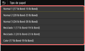 Cuando se carga papel en la bandeja multiuso, aparece la siguiente pantalla en el panel de control. Configure el tamaño y el tipo de papel según el papel cargado.