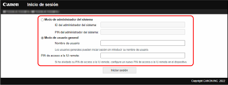 Para usar la IU remota, introduzca la dirección IP del equipo en un navegador web en un ordenador e inicie sesión con el modo de administrador del sistema o el modo de usuario general. Las funciones disponibles con la IU remota varían en función del modo en el que haya iniciado sesión.