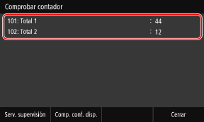 Operaciones disponibles en la pantalla para comprobar el contadorPulse [Serv. supervisión] para comprobar la conexión al servidor de supervisión. Lleve a cabo esta operación para enviar la información del equipo al servidor de supervisión de forma periódica. Pulse [Comp. conf. disp.] para comprobar la configuración de las opciones en el equipo.