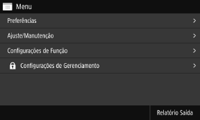 Alterando a exibição da telaVocê pode alterar a exibição do painel de controle, alterando, por exemplo, o idioma e as unidades de exibição, e mostrar ou ocultar mensagens. [Configurações de Exibição] Você pode inverter as cores da tela e ajustar o brilho para facilitar a visualização da tela. [Acessibilidade] Apagando as configurações automaticamentePor padrão, se nenhuma operação for realizada após um determinado período de tempo, as configurações definidas na tela serão apagadas e a tela [Início] é exibida. Você pode alterar o tempo até que as configurações sejam apagadas e a tela que é exibida depois. [Redef. Hora Automaticamente] [Funcionar Após Reinic. Auto] |
