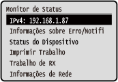 no painel de controle. Use esta tela para verificar as informações da máquina, uso e registros, configurações de rede e informações de erro. Tela [Monitor de Status]Modelo de Painel de operação | Modelo LCD Preto e Branco | |