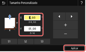2 | Digite os valores em [X] e [Y] e pressione [Aplicar]. Selecione [X] ou [Y], e digite o comprimento de cada lado usando [+] e [-], com  /  para mover o cursor entre os dígitos para inserção de números inteiros e frações. Quando tamanhos fora do padrão usados com frequência são registrados, você pode acessá-los pressionando [S1] a [S3]. |