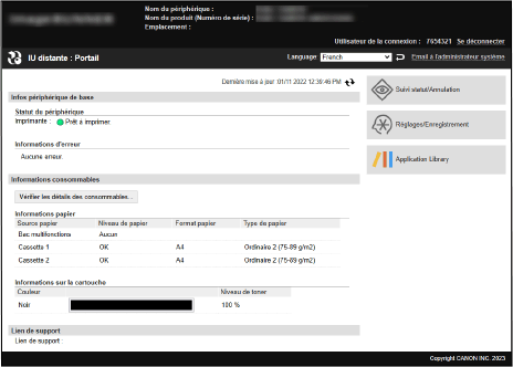 Lorsque vous vous connectez à l'interface utilisateur distante, la page Portail (page d'accueil de l'interface utilisateur distante) s'affiche. Depuis cette page, vous pouvez vérifier l'état d'utilisation de l'appareil, afficher diverses informations et changer les paramètres au moyen de boutons.