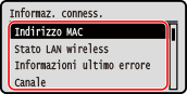 Oltre all'indirizzo MAC e alle informazioni di connessione della LAN wireless, quando la macchina è connessa a una LAN wireless, è possibile vedere anche le impostazioni di sicurezza.