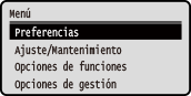 Cambiar la visualización de pantallaPuede cambiar elementos de visualización del panel de control como el idioma y las unidades, y mostrar u ocultar mensajes. [Opciones de visualización] Puede invertir los colores de la pantalla y ajustar el brillo para que se vea mejor. [Accesibilidad] Borrar las opciones automáticamenteDe forma predeterminada, si no se realiza ninguna operación durante un determinado periodo de tiempo, se borran las opciones configuradas en la pantalla y aparece la pantalla [Inicio]. Puede cambiar el tiempo que debe transcurrir antes de que se borren las opciones y aparezca la pantalla posterior. [Tiempo reinic. auto.] [Función tras reinicio auto] |