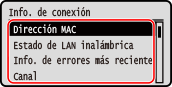Además de la dirección MAC y la información de conexión de la LAN inalámbrica cuando la máquina esté conectada a una LAN inalámbrica, puede ver las opciones de seguridad.