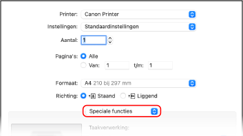 2 | In het snelmenu voor afdrukopties selecteert u [Speciale functies]. Als er geen afdrukopties worden weergegeven, klikt u op [Toon details] in het afdrukdialoogvenster. |