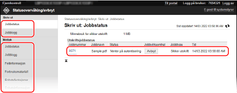 Dette viser status for alle utskriftsjobber uavhengig av innstilling for Administrere Avdelings-ID.