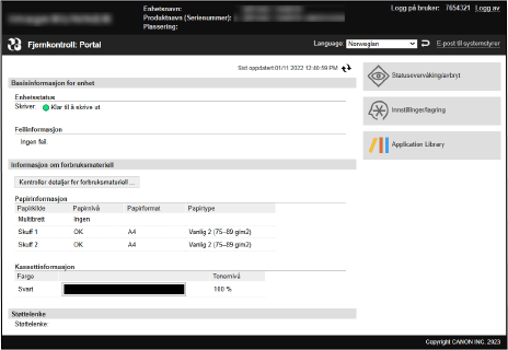 Når du logger inn på Fjernkontroll, vises portalsiden (fremsiden for Fjernkontroll). Herfra kan du sjekke brukstatus for maskinen, vise ulik informasjon og endre innstillingene ved bruk av knapper.
