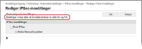 Kontrollere bruk og logger med Fjernkontroll [Innstillinger/lagring] Klikk her for å vise skjermbildet [Innstillinger/lagring]. Hvis du logget inn med Systemstyrer-modus, kan du endre hvilke som helst innstillinger, og utføre handlinger som å lagre og importere data. Elementene som kan angis på skjermbildet [Innstillinger/lagring] er nesten de samme som på kontrollpanelet men enkelte elementer kan kun stilles inn med enten kontrollpanelet eller Fjernkontroll. Menyelementer for innstillingerAvhengig av elementet, kan du starte maskinen på nytt for innstillingene som skal brukes. Hvis en omstart er nødvendig, vises en melding øverst på skjermen. |
