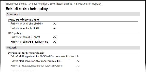 Innholdet som er stilt inn på en annen enhet eller programvare, iverksettes på sikkerhetspolicyen for maskinen. Derfor kan det være funksjonelementer i sikkerhetspolicyen som ikke er tilgjengelig på denne maskinen, men disse påvirker ikke innstillinger eller bruken av maskinen.