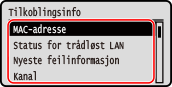 I tillegg til MAC-adressen og tilkoblingsinformasjon for trådløst LAN når maskinen er koblet til et trådløst LAN, kan du også vise sikkerhetsinnstillingene.