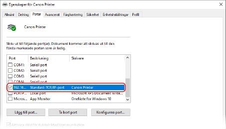 På fliken [Portar] ska du kontrollera att kryssrutan [Aktivera stöd för dubbelriktad kommunikation] markerad.