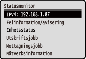 på kontrollpanelen. Använd den här skärmen när du vill kontrollera information om enheten, användning och loggar, nätverksinställningar samt felinformation. Skärmen [Statusmonitor]