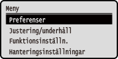 Ändra skärminställningarDu kan ändra inställningarna för hur kontrollpanelen visas. Du kan t.ex. ändra språk och måttenheter samt visa eller dölja meddelanden. [Skärminställningar] Du kan invertera färgerna och ändra ljusstyrkan för att det ska vara lättare att läsa på skärmen. [Hjälpmedel] Ta bort inställningar automatisktOm ingen åtgärd har utförts under en viss tidsperiod är standardinställningen att angivna inställningar på skärmen tas bort och skärmen [Hem] visas. Du kan ändra tiden tills inställningarna tas bort och nästa skärm visas. [Autoåterställning av tid] [Funktion eft. autoåterställn.] |
