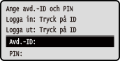 När Hantering av avdelnings-ID används visas följande inloggningsskärm. Ange avdelnings-ID för att logga in. Om PIN-kod används anger du PIN-koden.