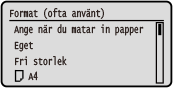När papper fylls på i multiutmatningsfacket visas följande skärm på kontrollpanelen. Ange pappersformat och papperstyp i överensstämmelse med det påfyllda papperet.