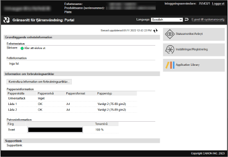 När du loggar in på fjärranvändargränssnittet visas portalsidan (startsidan i fjärranvändargränssnittet). Härifrån kan du kontrollera enhetens åtgärdsstatus, se olika typer av information och ändra inställningar för knappfunktionerna.