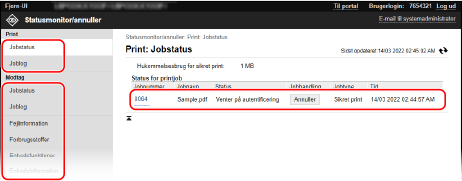 Fra Statusmonitor/annuller i Fjern-UI kan du kontrollere status og logfiler for en funktion, betjeningsstatus for maskinen og fejloplysninger.
