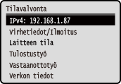. Käytä tätä näyttöä, kun haluat tarkistaa laitteen tiedot, käytön ja lokit, verkkoasetukset ja virheen tiedot. [Tilavalvonta]-näyttö