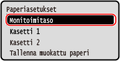 Jos monikäyttötasolla käytetään aina samaa paperia, voit rekisteröidä paperin koon ja tyypin. Tämä estää paperiasetusnäytön tulemisen esiin ja säästää asetusten määrittämisen vaivalta.