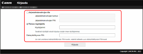 Järjestelmänvalvojan tunnus ja PIN-koodi* Jos kirjaudutaan järjestelmänvalvojatilaan, järjestelmänvalvojan PIN-koodiksi täytyy vaihtaa muu kuin oletusasetus.