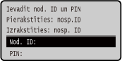 Ja ir iestatīts sistēmas administratora ID, tiek parādīts pieteikšanās ekrāns darbībām, kurām ir nepieciešamas administratora privilēģijas. Lai pierakstītos, ievadiet sistēmas administratora ID un PIN.