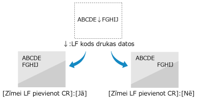 Ja ir izvēlēts iestatījums [Jā], drukāšanas pozīcija tiek pārvietota uz nākamās rindiņas sākumu pēc tam, kad iekārta saņem LF kodu.