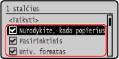 Popieriaus formatai, kurių žymės langeliai išvalyti, nerodomi popieriaus parametrų ekrane.