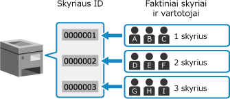 Pagal naudojimo aplinką ir tikslą naudotojams ir grupėms priskirkite skyriaus ID. Be to, nustatę skyriaus ID PIN galite neleisti neteisėtos prieigos ir griežčiau valdyti.