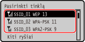 Ieškokite belaidžio LAN maršrutizatoriaus (prieigos taško), prie kurio norite prisijungti, ir įveskite tinklo raktą.