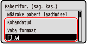 Kui paber on mitmeotstarbelisse salve laaditud, kuvatakse juhtpaneelil paberiformaadi ja -tüübi seadistamise kuva.