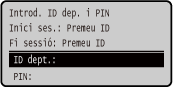 Si la Gestió de l'ID de departament està configurada, apareixerà la següent pantalla d'inici de sessió. Introduïu l'ID de departament per iniciar la sessió. Si hi ha un PIN definit, introduïu-lo.