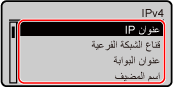 تعيين عناوين IPv4 تعيين عناوين IPv6 قد يؤدي توصيل الجهاز بموزع تحويل، على سبيل المثال، إلى منع الاتصال بالشبكة حتى وإن تم تكوين عنوان IP بطريقة صحيحة. في هذه الحالة، قم بتعيين وقت انتظار حتى يبدأ الجهاز في التواصل ومحاولة الاتصال مرة أخرى. [مهلة الاتصال عند التشغيل]