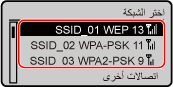 لتحديد طريقة مصادقة أو تشفير مختلفة، استخدم طريقة الإعداد اليدوي للاتصال. الاتصال بشبكة LAN لاسلكية من خلال تعيين التفاصيل (طريقة الإعداد اليدوي)