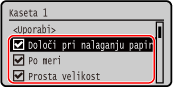 Na zaslonu z nastavitvami papirja so prikazane registrirane pogosto uporabljene velikosti papirja. Če so prikazane neuporabljene velikosti papirja, jih lahko skrijete za posamezne vire papirja, da lažje izberete velikost papirja.