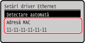 Puteți vizualiza adresa MAC setată la aparat atunci când aparatul este conectat la rețeaua LAN cu fir.