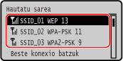 Autentifikazio- edo zifratze-metodo ezberdin bat zehazteko, erabili eskuzko konfigurazio-metodoa konektatzeko. Xehetasunak ezarriz konektatzea hari gabeko LAN batera (eskuzko konfigurazio-metodoa)